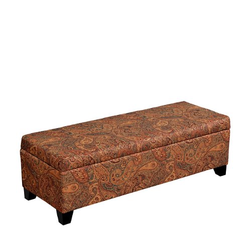 Covered in a beautiful 100-percent polyester multicolored paisley fabric with a rich burgundy background . Stylish and functional wall-hugger hinged bench storage ottoman. Wall hugger bench can fit up against a wall while still being able to open the lid easily. Hinged top easily lifts to store items out of sight. Tapered wooden legs. Perfect for the end of the bed, child's room or hallway. Available to use as additional seating. Hinged ottoman has plenty of storage space. Interior storage holds 5 cubic feet or 35 gallons. Solid hardwood frame. and efficient product design uses less fossil fuel based components in construction and delivery. Break it down to recycle at the end of use for additional piece of mind. Each piece ships in one (1) box. Welcome to Handy Living: Your kind of furniture. Right. Now. Their goal is simple: put full size upholstered furniture in a single box that will ship via common carrier to every doorstep. Handy Living has made everyday furniture exciting and different. They believe furniture should be stylish and fun. It should be affordable. It should be easy to deliver quickly and conveniently in a single box - and ridiculously easy to assemble. And it should be environmentally responsible. Handy Living - Thinking Inside the Box.